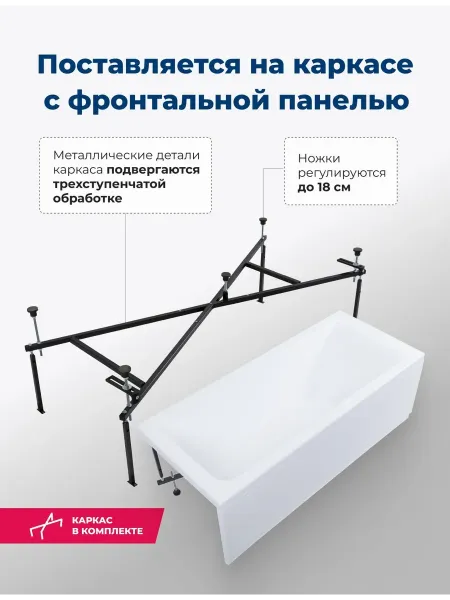 Ванна уже установлена на жесткий сварной каркас из металлического профиля. Металлические детали каркаса подвергаются трехступенчатой обработке, когда сначала профильная труба проходит абразивную зачистку на специальном станке, после чего готовые детали обрабатывают каустической содой, и, просушив, покрывают с помощью электростатического распылителя молотковой краской по металлу. Это гарантирует равномерность окрашивания и стойкость покрытия.