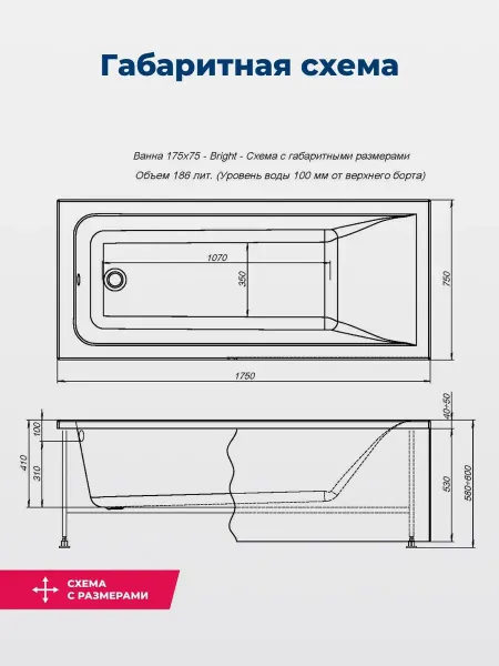 Акриловая ванна Aquanet Bright 347870 175x75 см с каркасом с боковой и фронтальной панелями