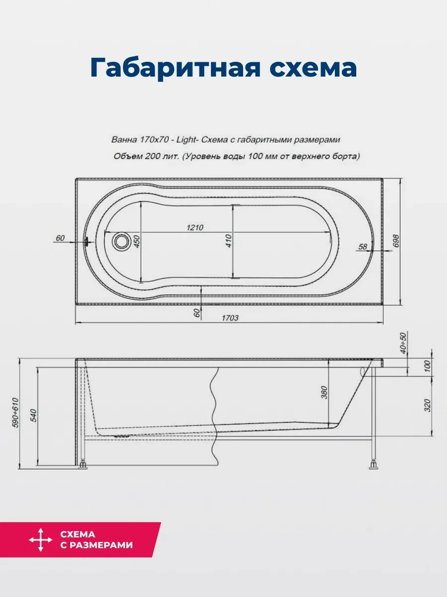 Акриловая ванна Aquanet Light 347155 170x70 см с каркасом и фронтальной панелью купить