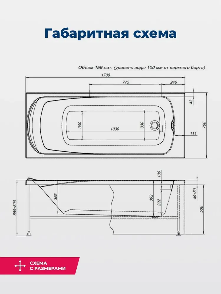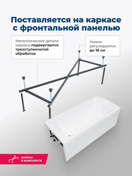 Обратите внимание, что это комплект: акриловая ванна, каркас и фронтальная панель. Ванна прямоугольная Aquanet Roma 170x70 выполнена в цвете «белый глянец» и имеет удобную форму. Ее глубина составляет 392 мм, благодаря чему ванна способна вместить в себя 159 литров воды. На днище ванны предусмотрено антискользящее покрытие, выполненное в виде небольших бугорков на поверхности. В изголовье предусмотрен подголовник. Прекрасный образец достойного качества в бюджетном воплощении. Ванна уже установлена на жесткий сварной каркас из металлического профиля. Металлические детали каркаса подвергаются трехступенчатой обработке, когда сначала профильная труба проходит абразивную зачистку на специальном станке, после чего готовые детали обрабатывают каустической содой, и, просушив, покрывают с помощью электростатического распылителя молотковой краской по металлу. Это гарантирует равномерность окрашивания и стойкость покрытия.