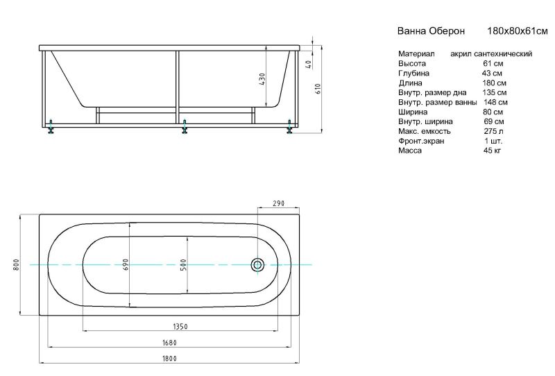 Габариты (Д Ш), см: 180х80Высота с опорой, см: 61Объем, л: 275 Форма: прямоугольнаяМонтаж: пристеннаяРасположение перелива: стандартноеДиаметр слива ванны, см: 5,2Материал: 100% литьевой акрилТолщина акрилового листа, мм: 4Гарантия: 20 летСтрана: Россия Вид опоры: каркас сборно-разборный сварной, есть в комплектеЭкран: фронтальный в комплектеСлив-перелив: есть, в комплектеАнтискользящее покрытие: нескользкая поверхностьПодголовник: приобретается отдельноРучки: приобретаются отдельно Система гидромассажа: установка по желаниюАэромассаж: установка по желаниюХромотерапия: установка по желаниюРучки, поручни для ванны: установка по желаниюВстроенные смесители: установка по желаниюИзменение конструкции каркаса: установка по желаниюОзонирование: нет, установка не предусмотренаЗащита от сухого пуска: установка по желаниюУправление: любое по желанию