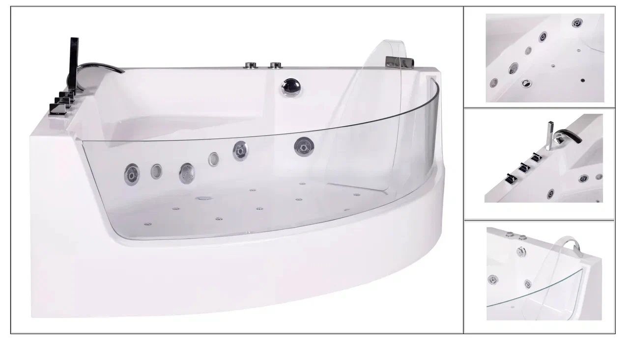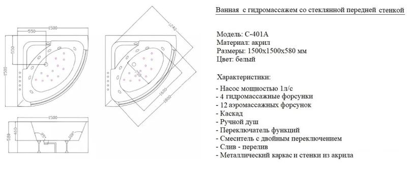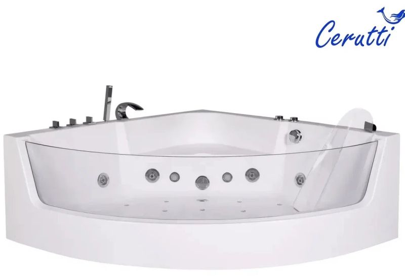 Акриловая гидромассажная ванна (джакузи) Ceruttispa C-401А (1500х1500х580) угловая, 4 гидромассажные форсунки, 12 аэромассажных форсунок, смеситель, подголовник, хромотерапияРазмер:1500x1500x580 ммОснащение:Гидромассажные форсунки : 4 штуки