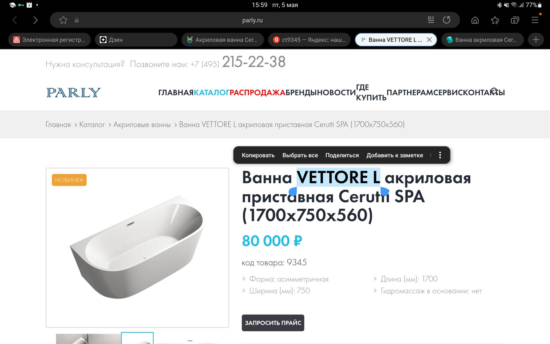 Акриловая ванна Cerutti SPA VETTORE L CT9345 170x75см купить