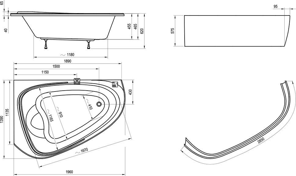- аксессуары: передняя панель, сточный комплект для ванны, подголовник