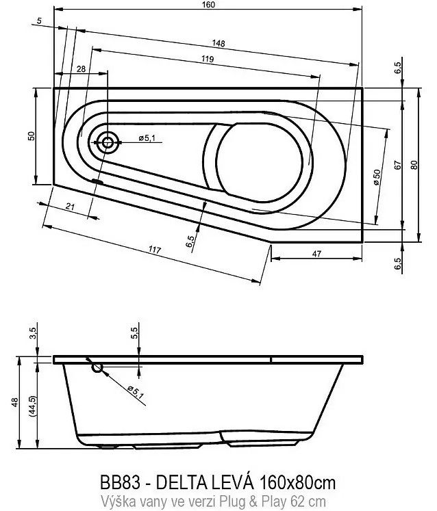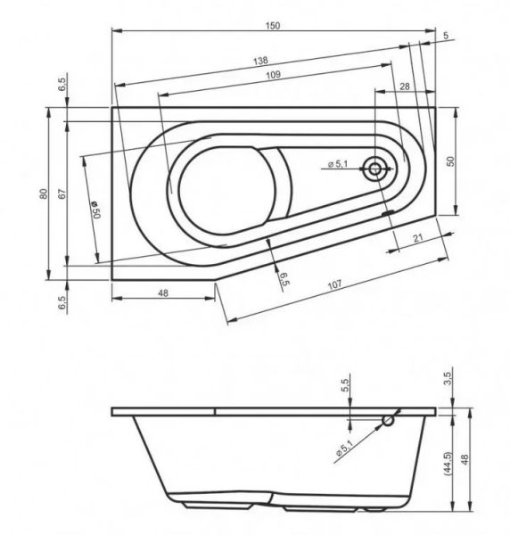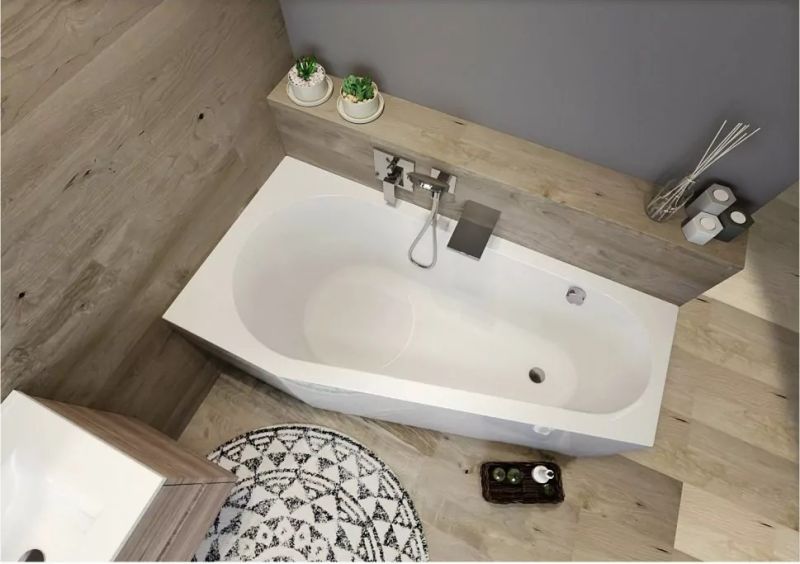 ?Асимметричная ванна RIHO Delta 160x80 L Plug & Play из глянцевого белого акрила, со скошенными краями представляет собой полностью собранную на заводе конструкцию.