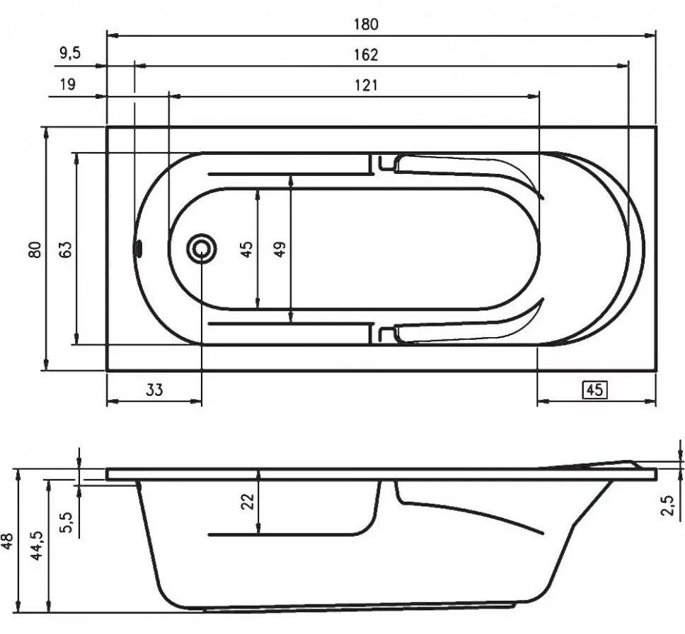 Конструкция ванны симметрична, поэтому может быть установлена в правом и левом углу.