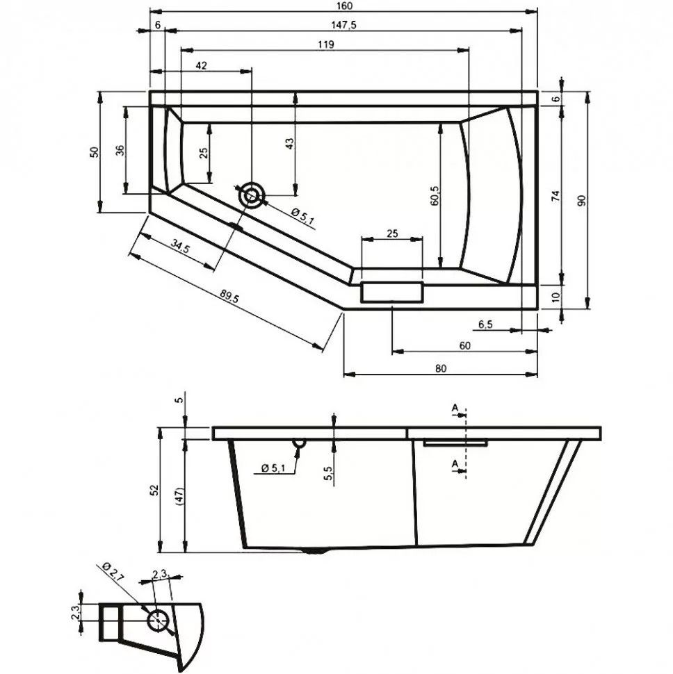 Ванна асимметричная, исполнение левое(L), сливное отверстие слева