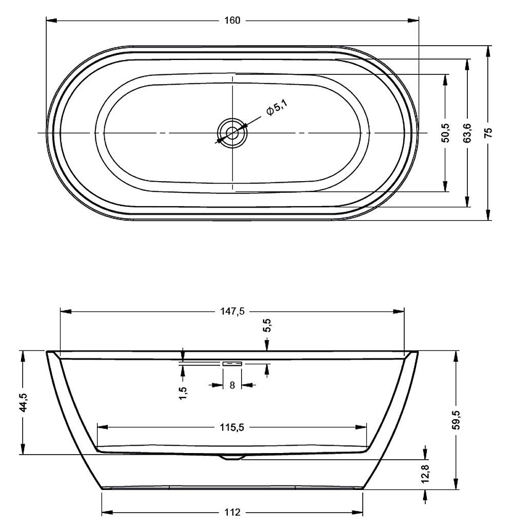 Отдельно стоящая, глянцевая белая акриловая ванна RIHO Inspire 160х75 FALL (заполнение через перелив) с двойными стенками, со встроенным переливом и нажимным донным клапаном.
