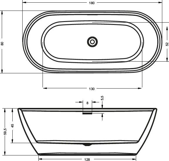 Отдельно стоящая, матовая белая акриловая ванна RIHO Inspire 180х80 FALL (заполнение через перелив) с двойными стенками, со встроенным переливом и нажимным донным клапаном.
