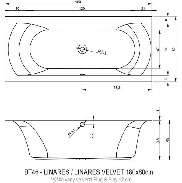 Прямоугольная? ванна RIHO Linares 180x80 L Plug & Play, из глянцевого белого акрила с закругленной внутренней формой и центральным сливом, представляет собой полностью собранную на заводе конструкцию.
