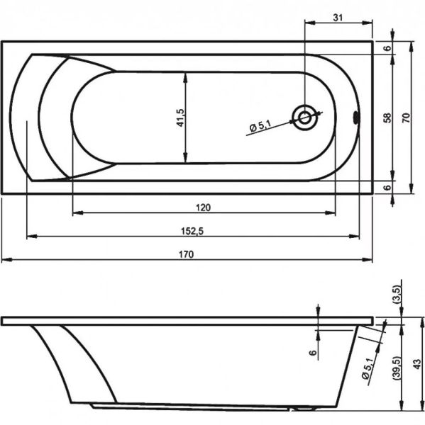Прямоугольная акриловая ванна RIHO Miami 170x70 изготовлена из высококачественного листа акрила глянцевого белого цвета