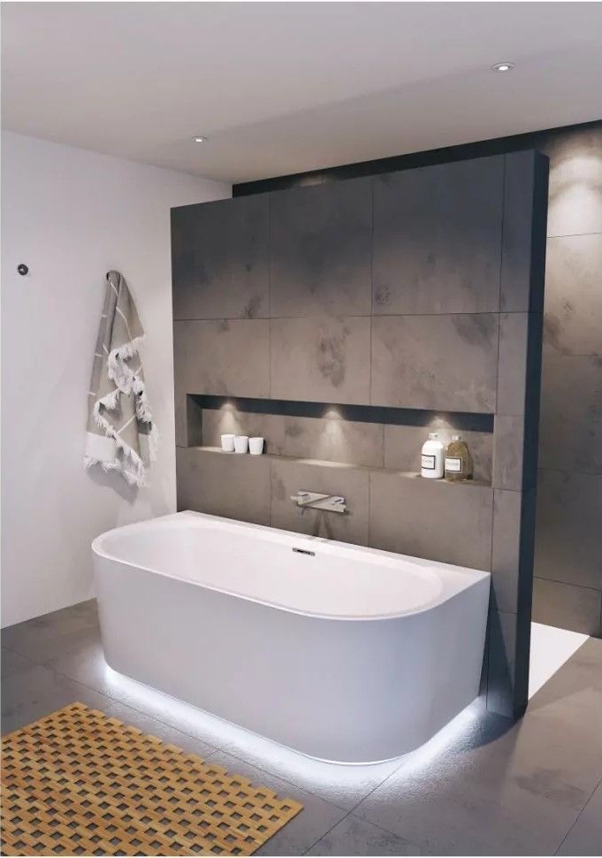 Отдельно стоящая пристенная, глянцевая белая акриловая ванна RIHO DESIRE BACK2WALL 180х84 LED с двойными стенками, со встроенным переливом и нажимным донным клапаном.