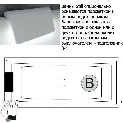 Акриловая ванна с подсветкой Riho Still Square LED Fall B099034005 180х80см светодиоды и подголовник слева заполнение через перелив белый