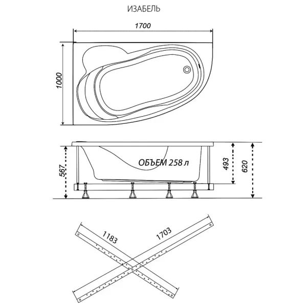 Акриловая ванна Triton Изабель Щ0000048750 правая 170x100 см на Х-каркасе белый