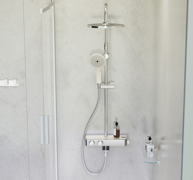 Душевая система с круглым верхним душем и термостатом.