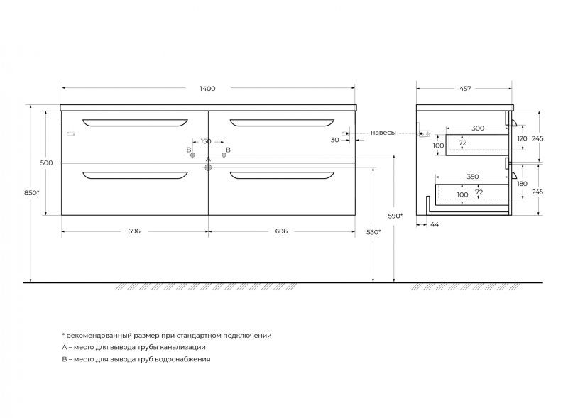 База под раковину Cezares подвесная с четырьмя выкатными ящиками для раковины с двумя чашами, Bianco Lucido, 1400x450x500, ECO-CER-N-1400-4C-SO-2-BL купить