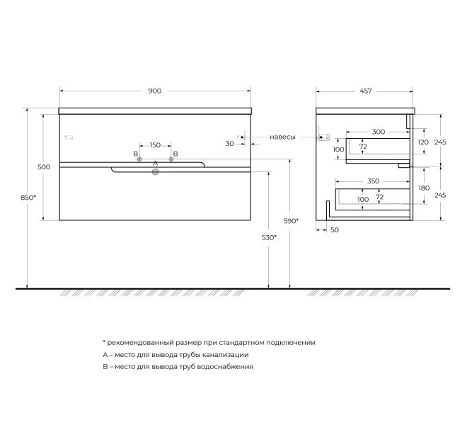 База под раковину Cezares подвесная с двумя выкатными ящиками, Bianco Lucido, 900x457x500, DUET-N-900-2C-SO-BL