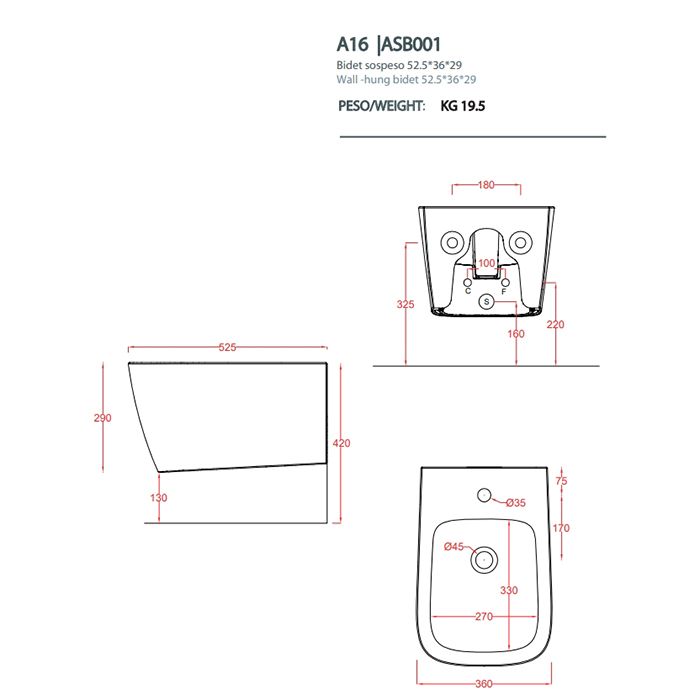 Биде Artceram A16 ASB001 05 00 белоеArtceram A16 Биде подвесное 36х52 см, 1 отверстие, цвет: матовый белый