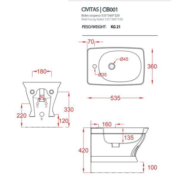 Биде Artceram Civitas CIB001 02 00 шампаньArtceram CIVITAS Биде подвесное 36х54 см, 1 отверстие, цвет: шампань