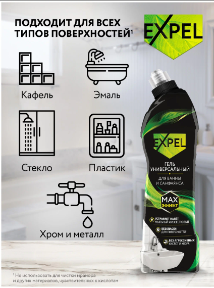 Баланс эффективности и безопасности геля достигается за счет применения лимонной кислоты. Благодаря своим свойствам эта природная кислота отлично очищает загрязнения и абсолютно безопасна для эмали и металлических поверхностей. Универсальный гель Expel подходит для всех типов поверхностей: