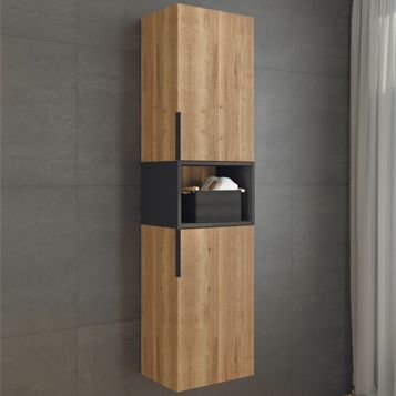 Подвесная шкаф колонна с двумя створками и пространством для открытого хранения. Створки оснащены петлями с плавным закрыванием и черными матовыми алюминиевыми ручками. Фасады из влагостойкого ЛДСП дуб темно-коричневый.