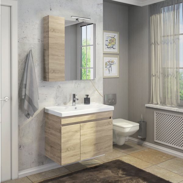 Название: Тумба-умывальник Артикул: Тромсе 80 Варианты цвета корпуса и фасада: Дуб Сонома Материал корпуса: влагостойкое ЛДСП Габариты (ШхВхГ): 800*630*450 мм Комплектация: раковина Fest 80 (санфарфор) Подвесная тумба с левой распашной дверцей и большим выдвижным ящиком. Петли створок и направляющие ящика оснащены механизмами плавного закрывания. Фасады ящика и дверцы выполнены из одной плиты, рисунок текстуры дерева состыкован.