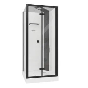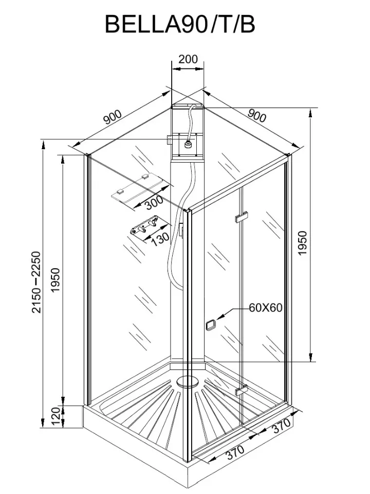Душевая кабина Ceruttispa BELLA90B 90x90 см чёрныйКабина BELLA90B душевая без крыши Ceruttispa. Размер: 90х90х215-225* см. Поддон белый, акриловый, с бортиком по периметру. Профиля алюминиевые, черного цвета из аннодированого алюминия. Переднее стекло закаленное, прозрачное, толщиной 5 мм. Боковое неподвижное стекло закаленное, прозрачное, толщиной 6 мм. Заднее стекло закаленное, супер прозрачное с белой покраской, толщиной 5 мм. Верхний тропический душ алюминиевый, с регулировкой высоты 5 см + 5 см (регулируется до установки). Смеситель и ручной душ квадратной формы, в цвет профиля. В комплекте сифон анти-запах.