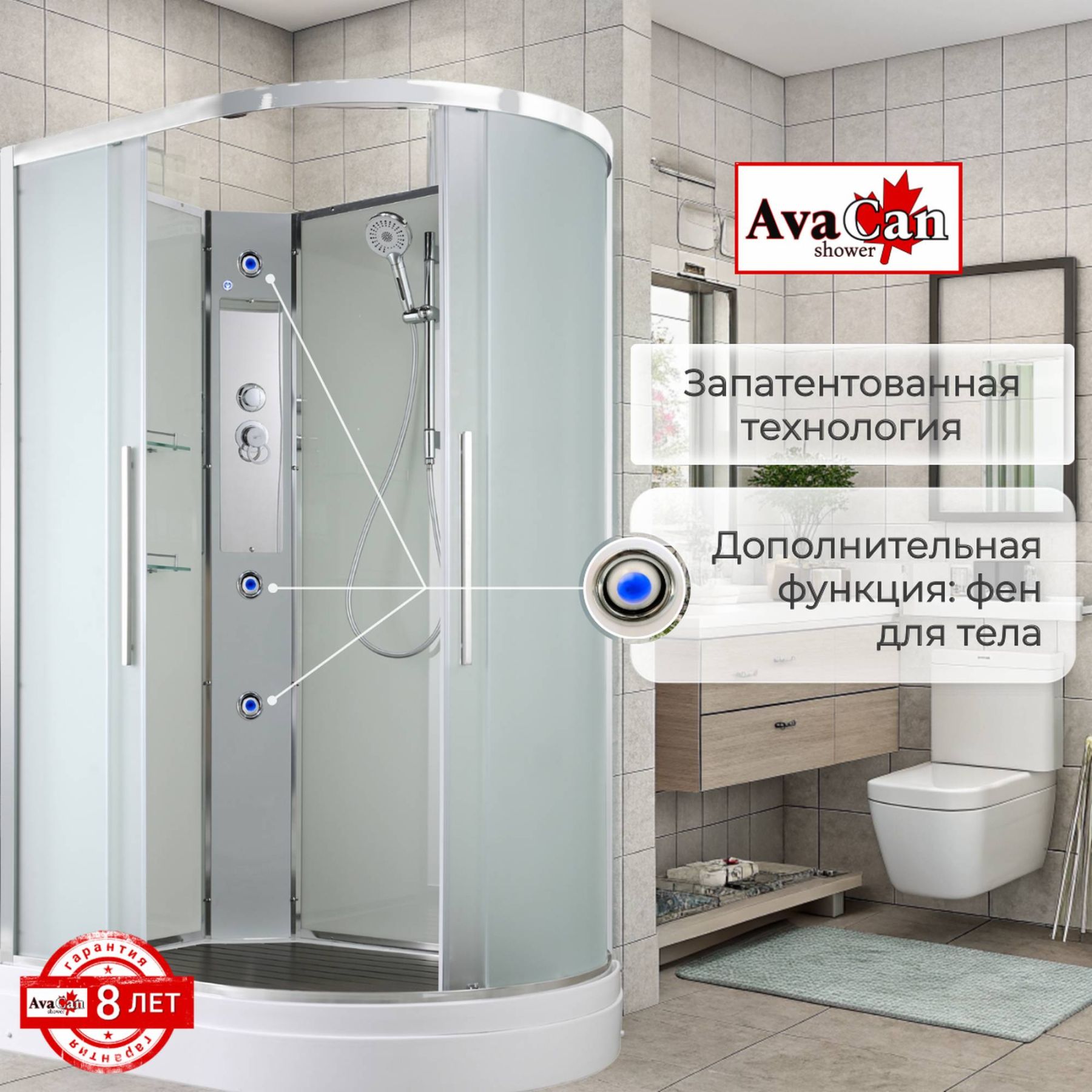 Стильная душевая кабина AvaCan EM2812LN сочетает в себе высокую функциональность, практичность и надежность. При изготовлении применяется безопасное закаленное стекло толщиной 5 мм (матовое), надежно фиксируемое алюминиевым профилем. Сборка без силикона (увеличивает срок службы), внутренняя сборка(облегчает установку и ревизию; позволяет установить в ограниченном пространстве), смеситель резьбовой (без хомутов). Съемный экран поддона (позволяет осуществлять ревизию сифона). Цвет профиля хром. Двойные металлические ролики дверей (увеличивают срок службы).В комплекте : душевая штанга, две полочки , арома-лейка с витамином С (картридж съемный),полимерная вставка в поддон(имитация дерева),сифон, ручки дверей из нержавейки , двойные ролики .