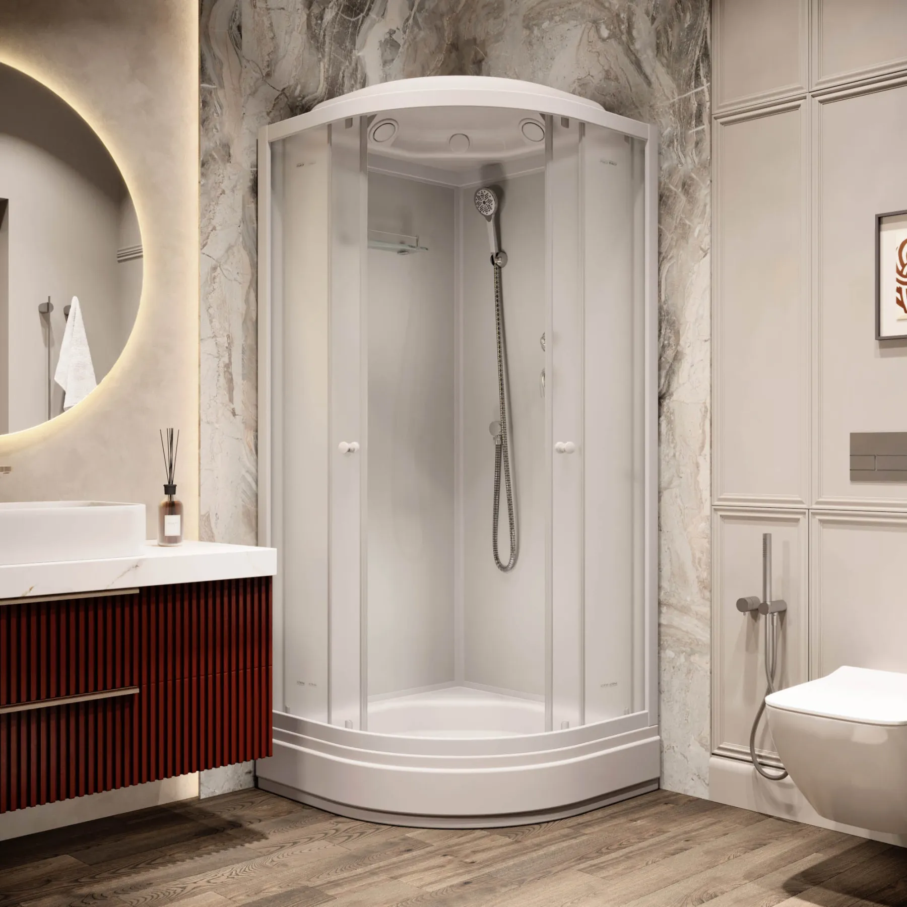 Поверхность поддона обладает противоскользящими свойствами, что делает использование кабины безопасным даже во влажных условиях. Также можно выбрать подходящую высоту бортика, чтобы избежать затопления пола.