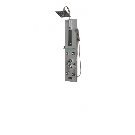 Панель серебристаяПолочкаЗеркалоРучной душ 3-х позиц.Верхний душСмеситель с переключением режимовДержатель ручки душаг/м форс.6штНабор водыВозможна установка на с тену и в угол