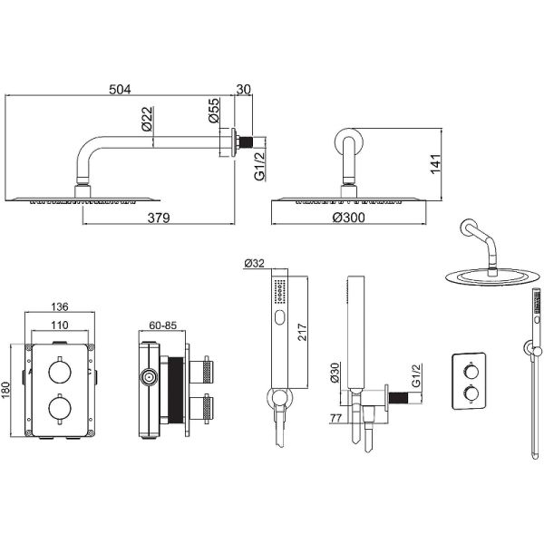 Верхний душ: 30х30 см.