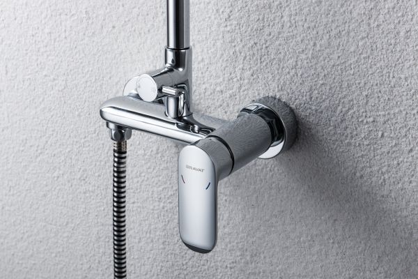 Душевая стойка для ванны Bravat Opal с большим квадратным верхним душем и смесителем без излива. Серия известна не только своим качеством, но и высоким уровнем эргономики.