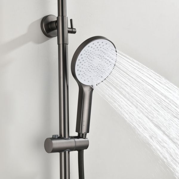 Душевая стойка производителя Black&White в цвете оружейная сталь. Корпус изделия изготовлен из сантехнической латуни, материал высокоресурсный и безопасный для здоровья. Управление потоками воды осуществляется с помощью керамического картриджа повышенной пропускной способности. Из потребителей на стойке установлен верхний душ, ручная лейка с режимами и излив, интегрированный в фронтальную часть корпуса. Для выбора режима работы установлен поворотный механический дивертор цилиндрической формы с насечками на корпусе для удобства использования мокрыми руками. Простые геометрические линии продукта гармонично встроятся в лаконичные интерьеры ванной комнаты.