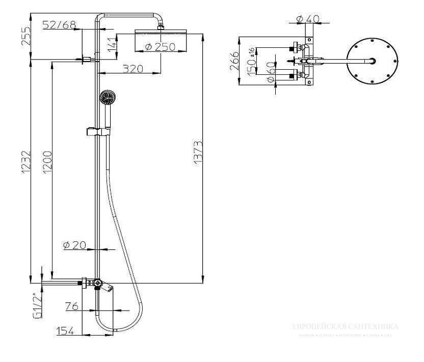 Стойка снабжена верхним душем диаметром 250 мм, который можно легко поворачивать, чтобы направить поток воды в нужном направлении, что делает процесс душа более приятным и удобным. В дополнение к верхнему душу предусмотрен ручной душ, который предоставляет дополнительную гибкость и возможность точного направленного орошения, что особенно полезно для мытья тела и волос.