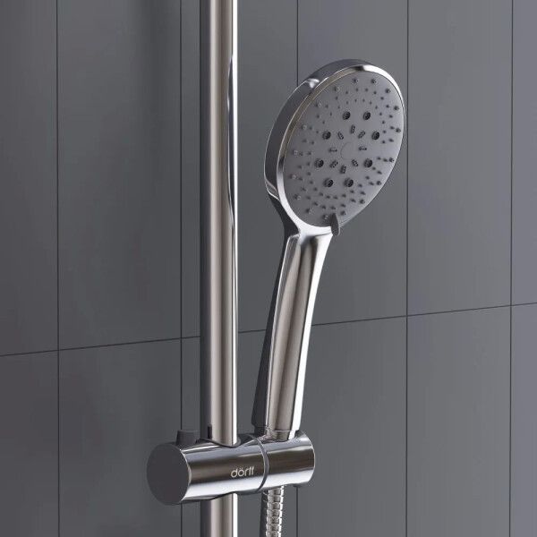 Душевая система Dorff New plus D0710400. Душевая система и смеситель для ванны и душа c термостатом по привлекательной цене. Душевая система Futura с тропическим душем, ручным душем с 3 функциями и длинным шлангом в 1500 мм - просто находка в своем сегменте. А стойки возможностью регулировки по высоте и шланги с защитой от перекручивания станут приятным бонусом для тех, кто ценит эргономичность и функциональность.Термостат душевых систем в элегантных современных размерах предотвратит от ожогов собрал в себе лучшие немецкие качества: стильный дизайн, компактные размеры, европейское качество, прочность и долговечность.Материал латунь, ПВХ (поливинилхлорид), нержавеющая сталь Количество режимов струи1УправлениеТермостатРазмер лейки, мм110Число монтажных отверстий4Стандарт подводки1/2"Количество потребителей2Назначение прибораДля ванны, Для душаВес с упаковкой, г2650Состав набора: Вентиль, Верхний душ, Держатель для лейки, Душевая лейка, Душевая штанга, Кронштейн для верхнего душа, Смеситель, Шланг для душаВнешнее исполнениеФорма душаКруглаяМонтажНа потолок, На стенуПоверхность изделияГлянцеваяСтильСовременныйИсполнение изливаМонолитный, С режимом "душ"Особенности: Защита от скручивания, Регулировка угла наклона, Автоматический девиатор, Ограничитель температурыДополнительныеТипДушевой комплектБрендDorffАртикулD0710400Страна-изготовительГерманияГарантия5 летЦветСеребристый хром