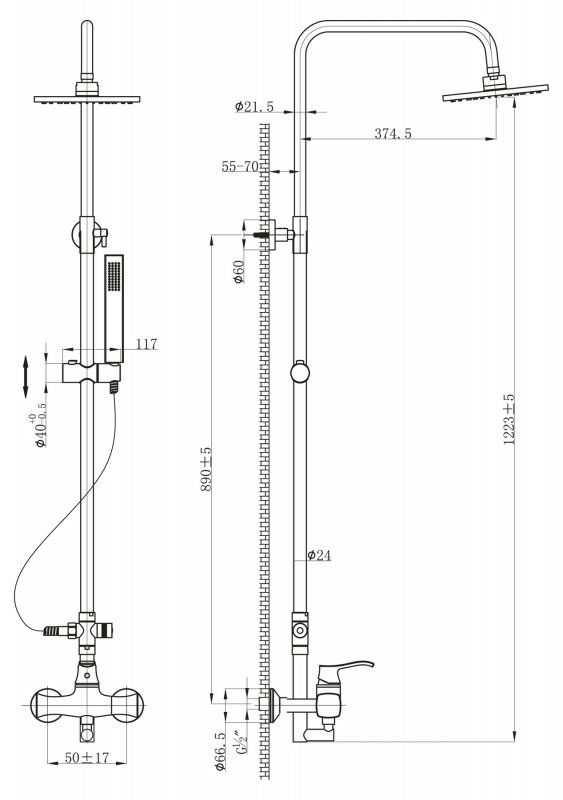 Оснащение: эксцентрики, дивертор, душевой шланг, душевая лейка, верхний душ, смеситель