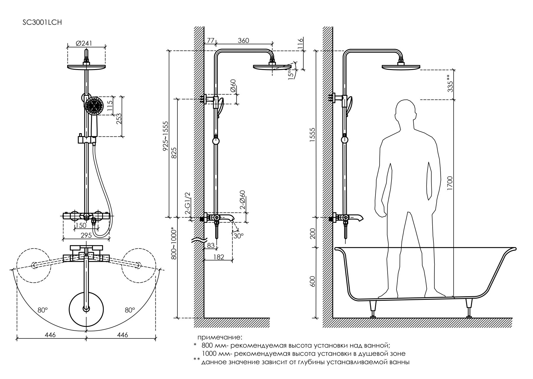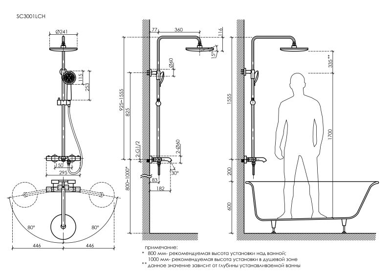 - Верхний душ из пластика ø240 мм с регулировкой наклона