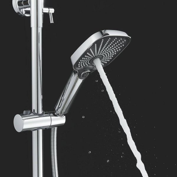Верхний душ размером 300x190 мм из ABS-пластика регулируется по высоте благодаря телескопической штанге и по наклону с помощью встроенного шарнира, что обеспечивает максимальный комфорт и удобство использования. Самоочищающиеся силиконовые форсунки предотвращают образование известкового налета и сохраняют чистоту и силу потока воды.
