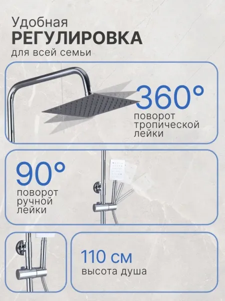 Душевой гарнитур содержит все необходимое для монтажа. Кроме того, наша душевая стойка хром имеет простой и быстрый монтаж, благодаря чему вы сможете установить ее самостоятельно без привлечения специалистов. Это позволит сэкономить время и деньги, а также получить удовольствие от процесса создания своего уютного уголка в ванной комнате.