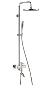 Верхний тропический душ D 250mm(ABS) -Ручной душ.Гибкий шланг 1.75 м. -Механический монокомандный смеситель со встроеным изливом -Душевая штанга (Латунь) регулируется по высоте -Пристенный вариант установки