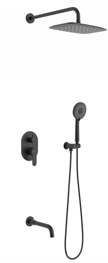 Душевой комплект BERGES VENTAS 3O - встраиваемый душевой комплект обладает трёхрежимной системой и состоит из верхней лейки - «тропического ливня», ручного душа, излива и смесителя.Лейка верхнего душа имеет инновационную систему самоочистки в виде гибких силиконовых вставок на форсунках душа, которые защищают изделие от известковых отложений. Верхний душ изготовлен из нержавеющей стали. Ручной душ – из ABS пластика. Оба душа имеют черное матовое покрытие, которое выглядит безупречно на протяжении всего периода эксплуатации.Шланг выполнен из нержавеющей стали (внутри epdm), смеситель с латунным корпусом имеет керамический картридж с пропускной способностью 28 л/мин, все держатели и кронштейны сделаны из латуни и нержавеющей стали.Скрытый монтаж комплекта позволяет создавать красивое и эргономичное внутреннее пространство всего помещения.