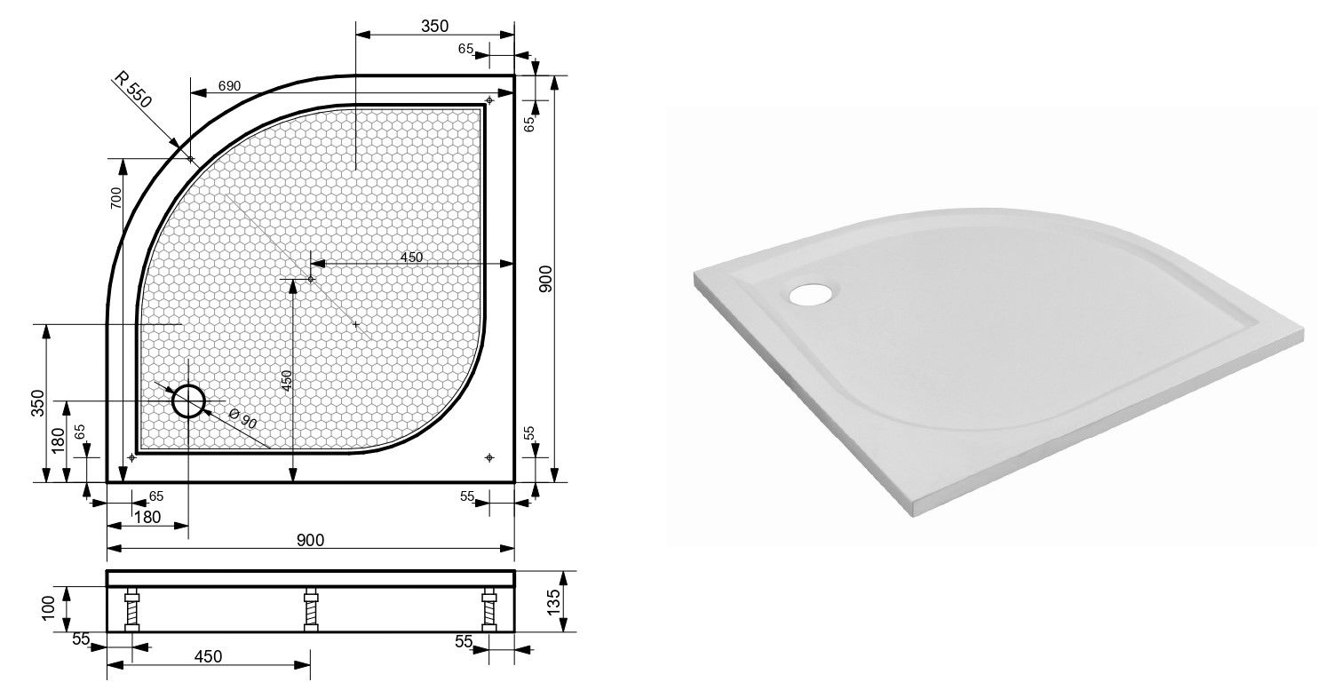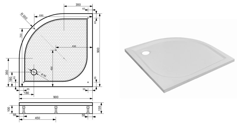 Для малогабаритных санузлов мы разработали угловые душевые поддоны. Поддон Омега имеет форму четверти круга. Бортики с внутренней стороны напоминают форму листочка.