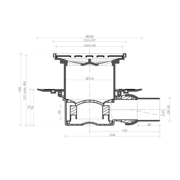 "Решетка: металл с перфорацией "Хром глянец". Базы: 1 - с 1 выходом, 4- S-образный сифон. Материалы: решетка - нержавеющая сталь AISI 304 SS, корпус, сифон - PP. Размеры решетки 100х100 мм и 150х150 мм, пропускная способность 48 л/мин, D=50 мм, поворот базы 360°, минимальная высота монтажа - 78 мм (для базы 2,3), 69 мм (для базы VERTICAL), гидрозатвор. Mask - с рамкой"