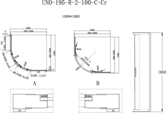 Душевой уголок четверть круга, хром BelBagno UNO-195-R-2-100-C-Cr