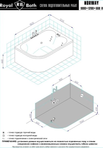 Акриловая ванна Royal Bath - идеальный выбор для создания атмосферы релакса и умиротворения, как в просторной в ванной комнате, так и в комнатном санузле. Основным преимуществом ванны из акрила считается её малый вес, высокая гигиеничность данного материала и низкая теплопроводность, долго сохраняющая комфортную температуру воды.Форма ванны Royal Bath замечательно подойдет к любому интерьерному решению, в различных вариантах размещения внутри ванной комнаты. Пристенная установка - это наиболее традиционный вид установки, а при использовании декоративного экрана пространство под ванной можно использовать как место хранения моющих средств. Оптимальная глубина позволяет принимать ванну с максимальным комфортом и полным расслаблением. Ванна Royal Bath выполнена со строгим соблюдением всех значительных элементов современного стиля.Благодаря тому, что родина бренда Royal Bath - Россия, можно смело быть уверенным в непревзойденном качестве и долговечности ванны, так как производство полностью соответствует стандартам качества. Акриловая ванна Royal Bath - это незаменимый, основной элемент любой ванной комнаты, без которого невозможно обойтись, ни в многоквартирном доме, ни в загородном коттедже.Комплектация гидромассажной ванны:- акриловая ванна Norway 180x120x66 с каркасом;- панель фронтальная к ванне Norway;- гидромассажная система на 6 форсунок;- спинной массаж на 6 форсунок;- аэромассаж с хромотерапией на 8 форсунок;- слив-перелив для ванны полуавтомат 60 см.Ожидаемый срок поставки 7 дней.Обратите внимание: данная позиция поставляется под заказ! Товар поставляется по 100%-ной предоплате.Данный товар является заказным и имеет индивидуально-определенные свойства.