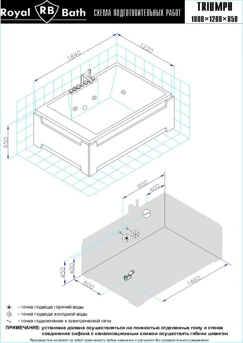 Акриловая ванна Royal Bath - идеальный выбор для создания атмосферы релакса и умиротворения, как в просторной в ванной комнате, так и в комнатном санузле. Основным преимуществом ванны из акрила считается её малый вес, высокая гигиеничность данного материала и низкая теплопроводность, долго сохраняющая комфортную температуру воды.Форма ванны Royal Bath замечательно подойдет к любому интерьерному решению, в различных вариантах размещения внутри ванной комнаты. Пристенная установка - это наиболее традиционный вид установки, а при использовании декоративного экрана пространство под ванной можно использовать как место хранения моющих средств. Оптимальная глубина позволяет принимать ванну с максимальным комфортом и полным расслаблением. Ванна Royal Bath выполнена со строгим соблюдением всех значительных элементов современного стиля.Благодаря тому, что родина бренда Royal Bath - Россия, можно смело быть уверенным в непревзойденном качестве и долговечности ванны, так как производство полностью соответствует стандартам качества. Акриловая ванна Royal Bath - это незаменимый, основной элемент любой ванной комнаты, без которого невозможно обойтись, ни в многоквартирном доме, ни в загородном коттедже.Комплектация гидромассажной ванны:- акриловая ванна Triumph 180х120х65 в сборе;- гидромассажная система на 8 форсунок (по 2 форсунки по бокам, 2 форсунки в ногах, 2 форсунки спина);- cмеситель на борт ванны RB Triumph 501;- слив-перелив для ванны полуавтомат 60 см.Ожидаемый срок поставки 7 дней.Обратите внимание: данная позиция поставляется под заказ! Товар поставляется по 100%-ной предоплате.Данный товар является заказным и имеет индивидуально-определенные свойства.