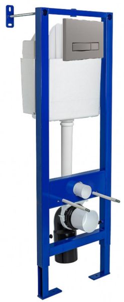 Узкая рама шириной 41 см.Металлический каркас, окрашенный антикоррозийной эмалью.Расчетная нагрузка 400кг. Объём резервуара воды 10 л с тепло- и шумоизоляцией.Подвод воды внутрь резервуара (G1/2 наружная).Объем смыва 3/6 литра с возможностью регулировки.Управление механическое, две кнопки.Межосевое расстояние под шпильки для подвеса унитаза 18 и 23 см. Полный комплект для установки включает в себяшумоизоляционную прокладку и лекало для монтажных отверстий.