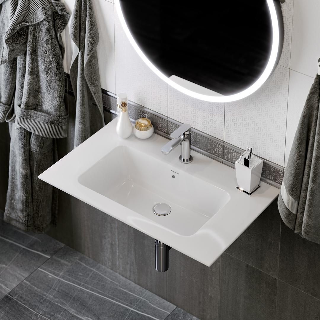 Тонкая белая глянцевая мебельная раковина с неглубокой чашей и отверстием под смеситель, ширина 75 см. Раковина с отверстием слив\перелив, расположение чаши в центре раковины. Донный клапан в комплект не входит, рекомендованный донный клапан DR.1/WHT. Сочетается с тумбами серии PIANO и смесителем серии PIANO.
