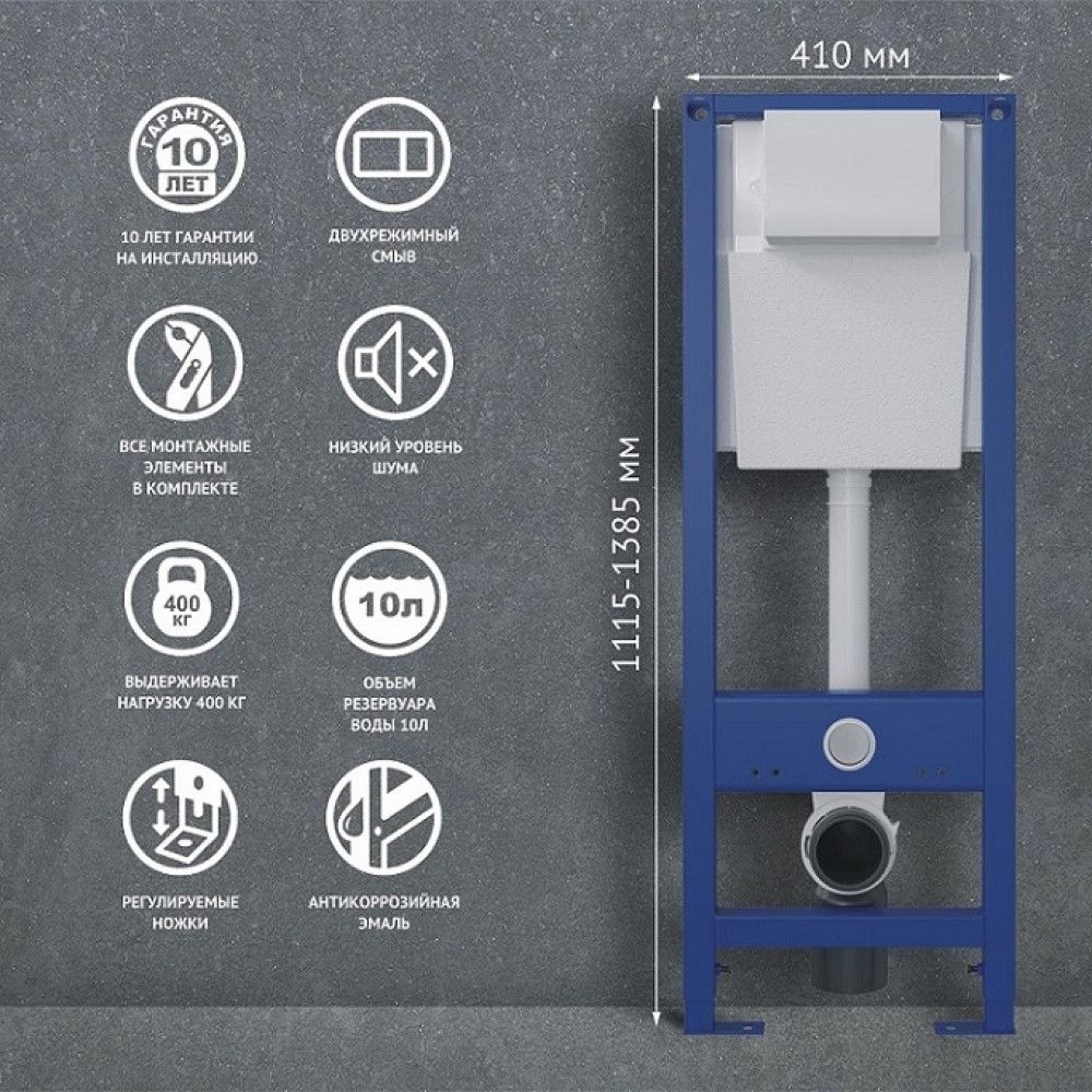 Полный Комплект ATOM Line для монтажа подвесного унитаза: инсталляция, cтальная рама с антикоррозийным покрытием, кнопка хром глянец, унитаз Gamma, сидение полипропилен Gamma PS с микролифтом.Расчётная нагрузка до 400 кг.Ножки c регулировкой высоты.Межосевое расстояние под крепежные шпильки унитаза 18 и 23 см.Бачок с функцией шумоподавления.Двухрежимная кнопка смываЭконом слив 3л, полный слив настраивается от 5,5 до 8,5л Монтажный кнопочный узел, полный комплект патрубков, лекала для монтажа отверстий; унитаз Gamma Rimless 52см, сидение полипропилен Gamma PS с микролифтом. Все крепежи для установки в комплекте. Гарантия 10 лет.