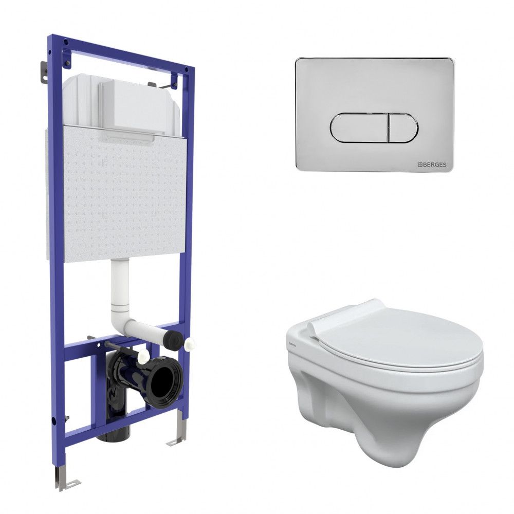 Полный комплект BERGES для монтажа подвесного унитаза. 1. Инсталляция NOVUM525Толщина бачка 80 мм.Межосевое расстояние под крепежные шпильки унитаза 18 и 23 см.Резервуар воды объемом 10 литров с тепло-шумоизоляцией.Уровень шума при давлении 3 бар не превышает 13 дБ.Подвод воды сверху (G1/2 наружная).Объем смыва 3/6 литра с возможностью регулировки. Металлический каркас, окрашенный антикоррозийной эмалью, расчетная нагрузка до 400 кг.Ножки регулировки высоты из оцинкованной стали. Возможность установки в угол. 2. кнопка D3глянцевый хром 3. унитаз ALBIT SБезободковая система смываантибактериальное покрытиеэкономия воды 4. сиденье дюропласт Top Slim SOмикролифт, быстросъем Все крепежи для установки в комплекте